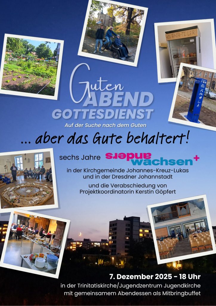 Das Projekt „anders wachsen“ in der Dresdner Kirchgemeinde Johannes-Kreuz-Lukas und in der Johannstadt endet im Dezember 2025 nach sechs Jahren. Die Förderungen des Lutherischen Weltbundes und der Ev. Luth. Landeskirche Sachsens laufen aus und es wird keine weitere Verlängerung geben.