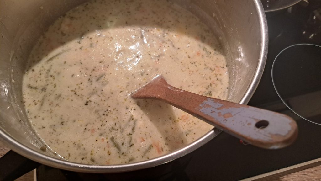 Mit Gemüsebrühe und (Koch-) Sahne angießen, kurz aufkochen lassen und dann 15-20 Min. köcheln lassen.