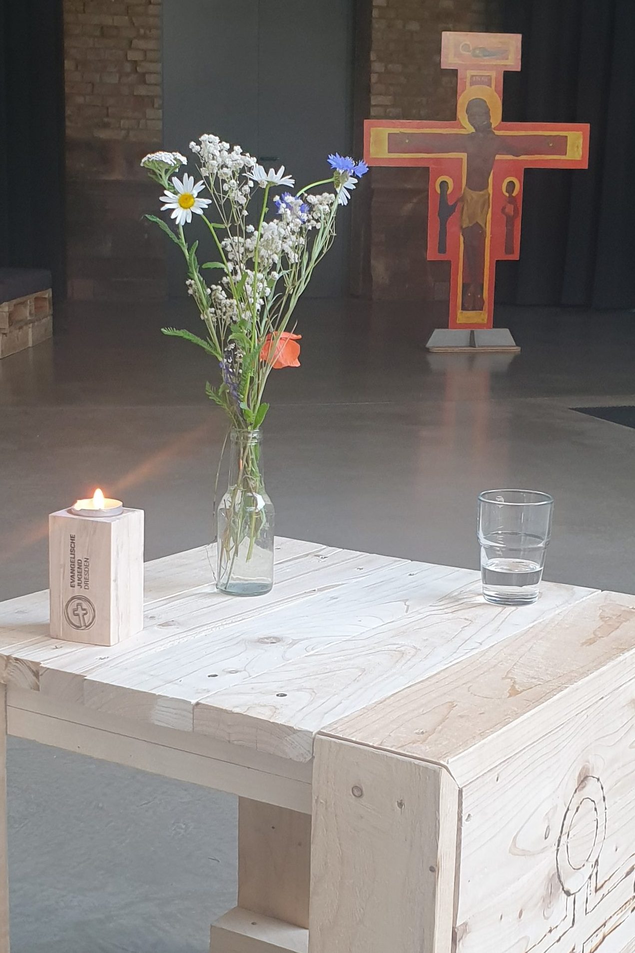 - ein Kreuz, Kerzen, Steine, Kisten – Material, um einen kleinen Altar zu bauen (ein Poster vom Taizé-Kreuz gibt es hier: https://made-by-taize.de/direkt-aus-taize/poster-karten/poster/606/kreuz-ikone-gross-einteilig – es lässt sich auf Holz aufziehen.)